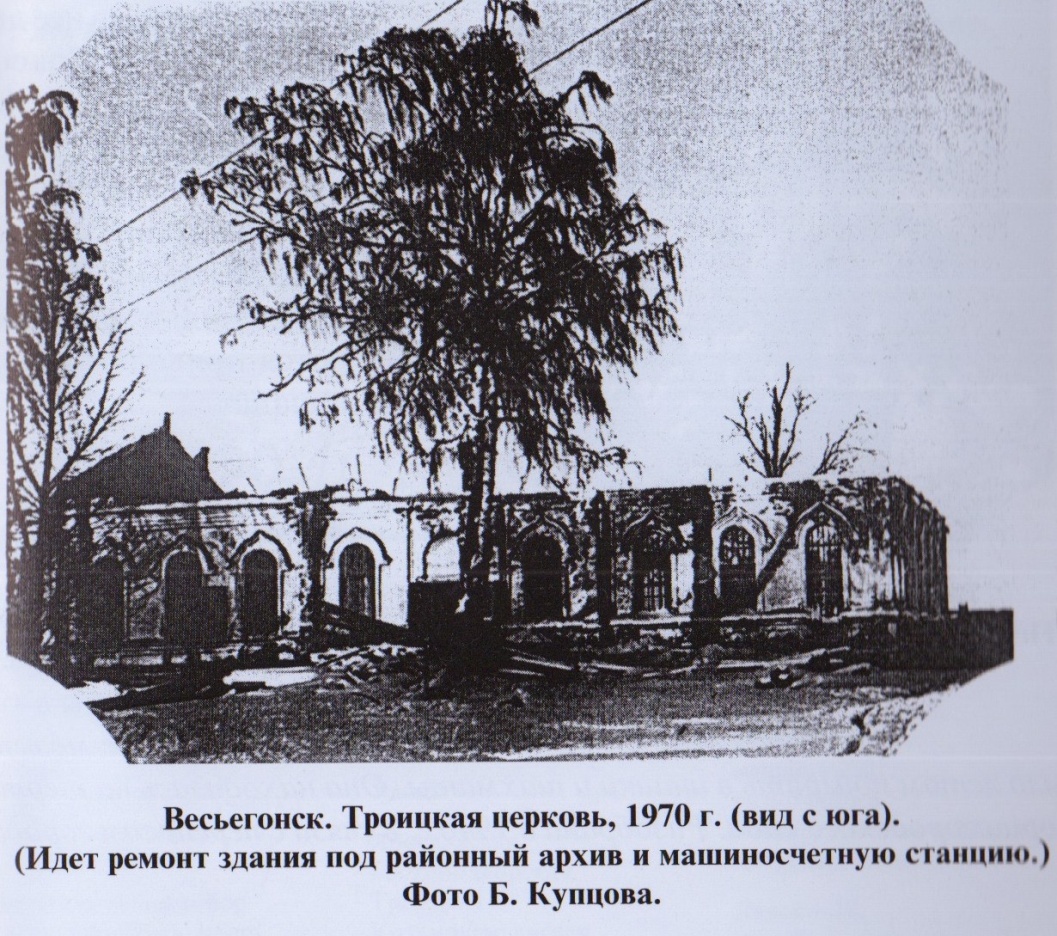 В книге «Храмы Весьегонского района» (авторы - краеведы Б.Ф. Купцов и А.И. Кондрашов) говориться следующее: «… в 1933-50-е годы в Троицкой церковь размещался кинотеатр, а затем в 1955 сюда из здания Казанской церкви переехал районный архив».